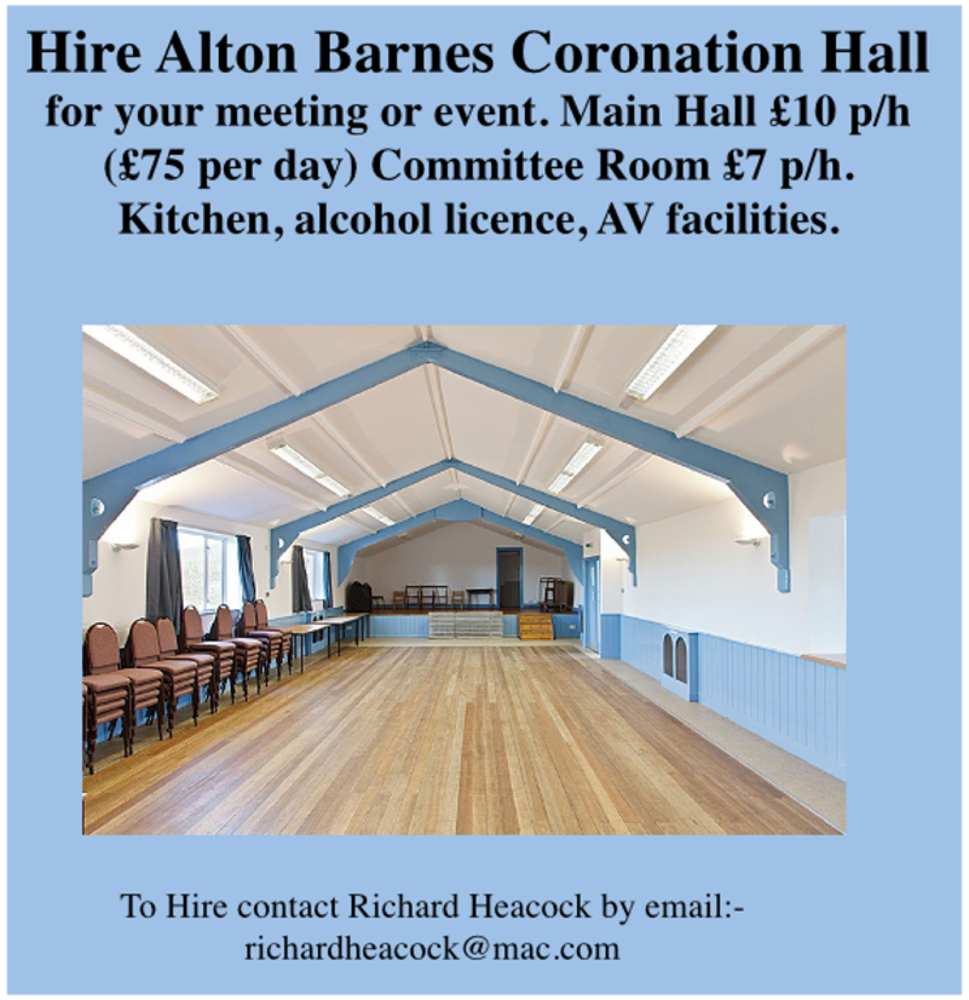 To contact the chair and committee of the Coronation Hall for any other business please email:- hall@altonsandhoneystreet.org.uk