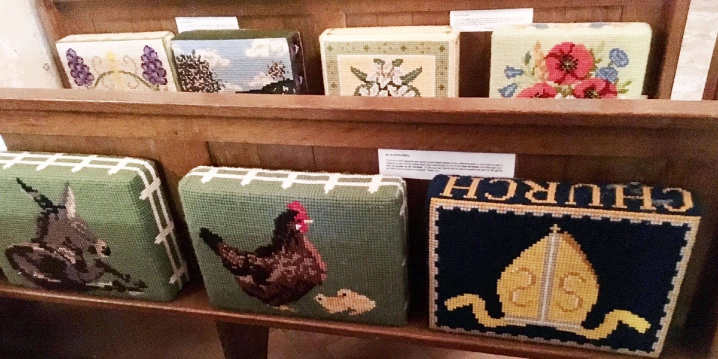 If enough people are interested in helping, there is a possible plan to make tapestry pew cushions for St Mary's similar in style to the kneelers in this photograph, but probably with rather simpler local designs: Woodborough Hill, the White Horse, the Canal, the Springs, Adam's Grave, flora and fauna etc. These would be tapestry panels, each one with the initials of the person who made it and the date. They would then be mounted on material and made into cushions, and should look very good in our church, as well as making the pews rather more comfortable. Please could anyone who enjoys doing tapestry and would like to know more about this project email:meriel@balston.co.uk.