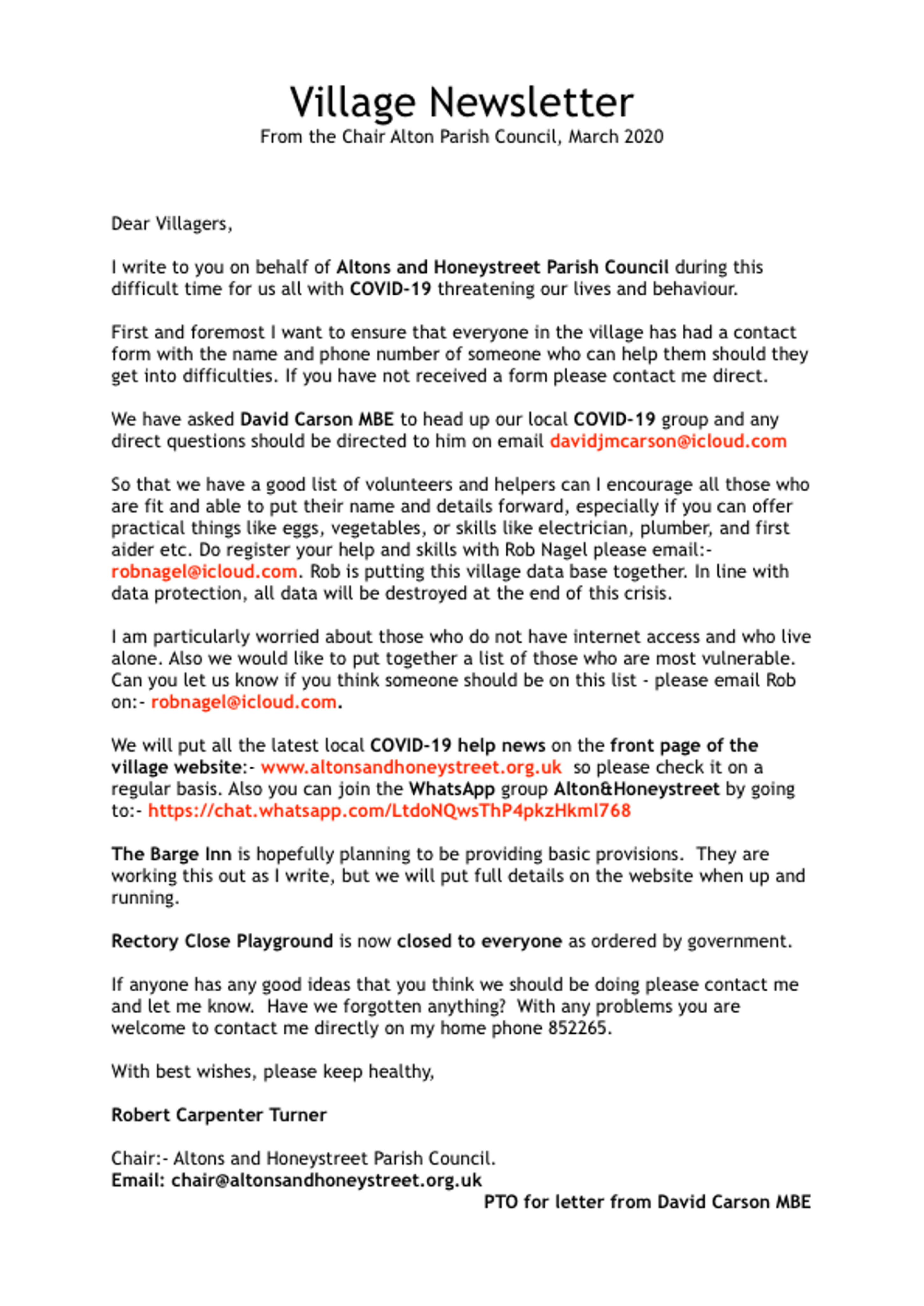 Lastly, please take a look at our website! We hope it will be increasingly useful as the best place to hear about local events, business, socialising, and voicing your view. Just go to http://altonsandhoneystreet.org.uk