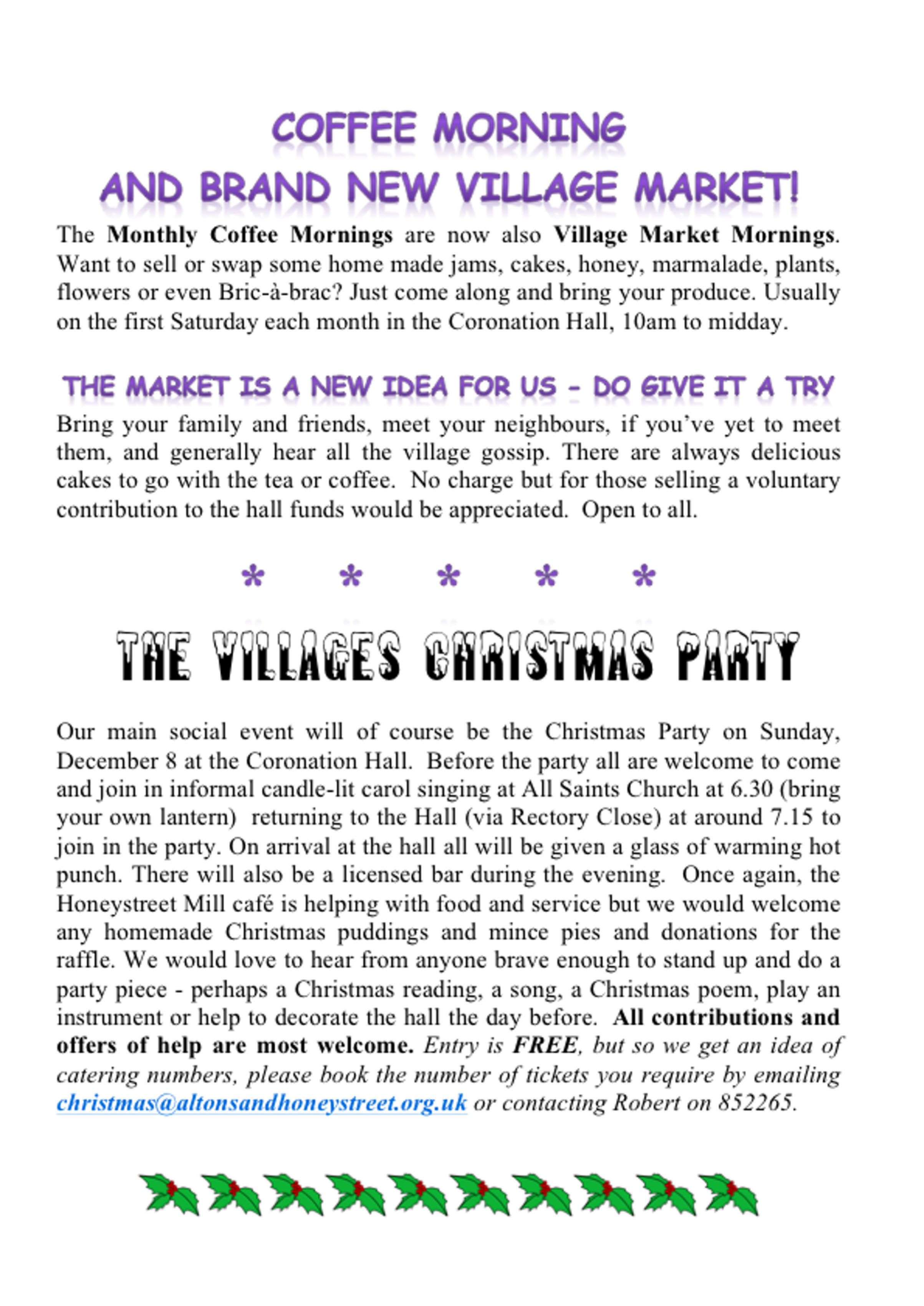 event will of course be the Coronation Hall Village Party on Sunday, December 9.All are welcome to come and join in candle–lit carols at All Saints Church at 6.30, returning to the Hall (via Rectory Close) at around 7.15 to join the party. The Honeystreet Mill cafe is helping with food and service but we would welcome any